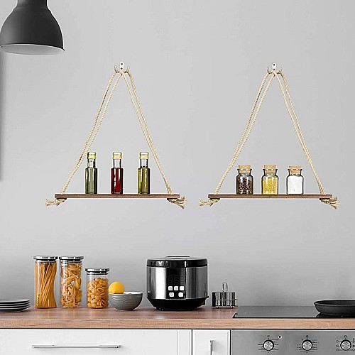 Etagere murale suspendue en bois Naturelle avec corde de jute